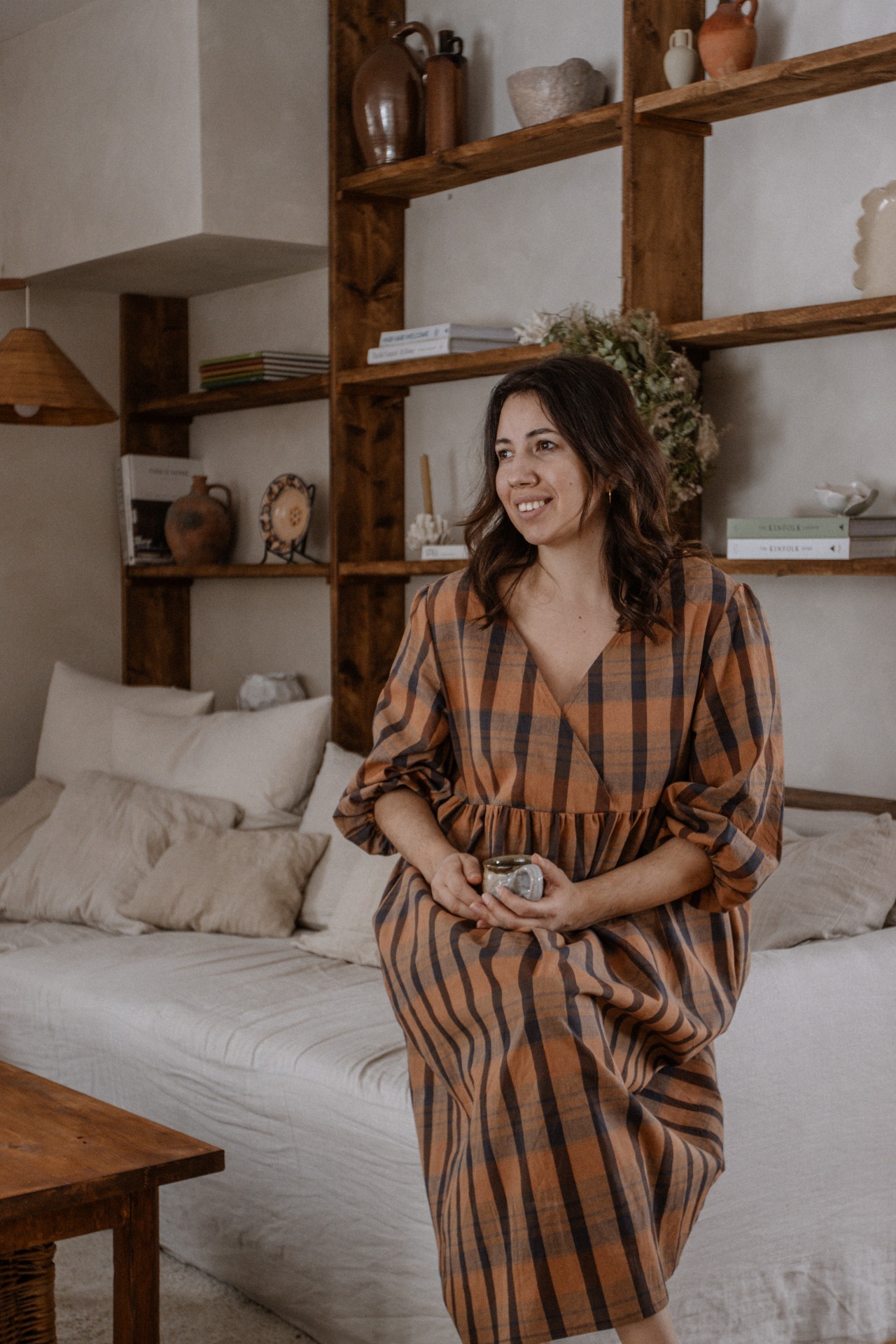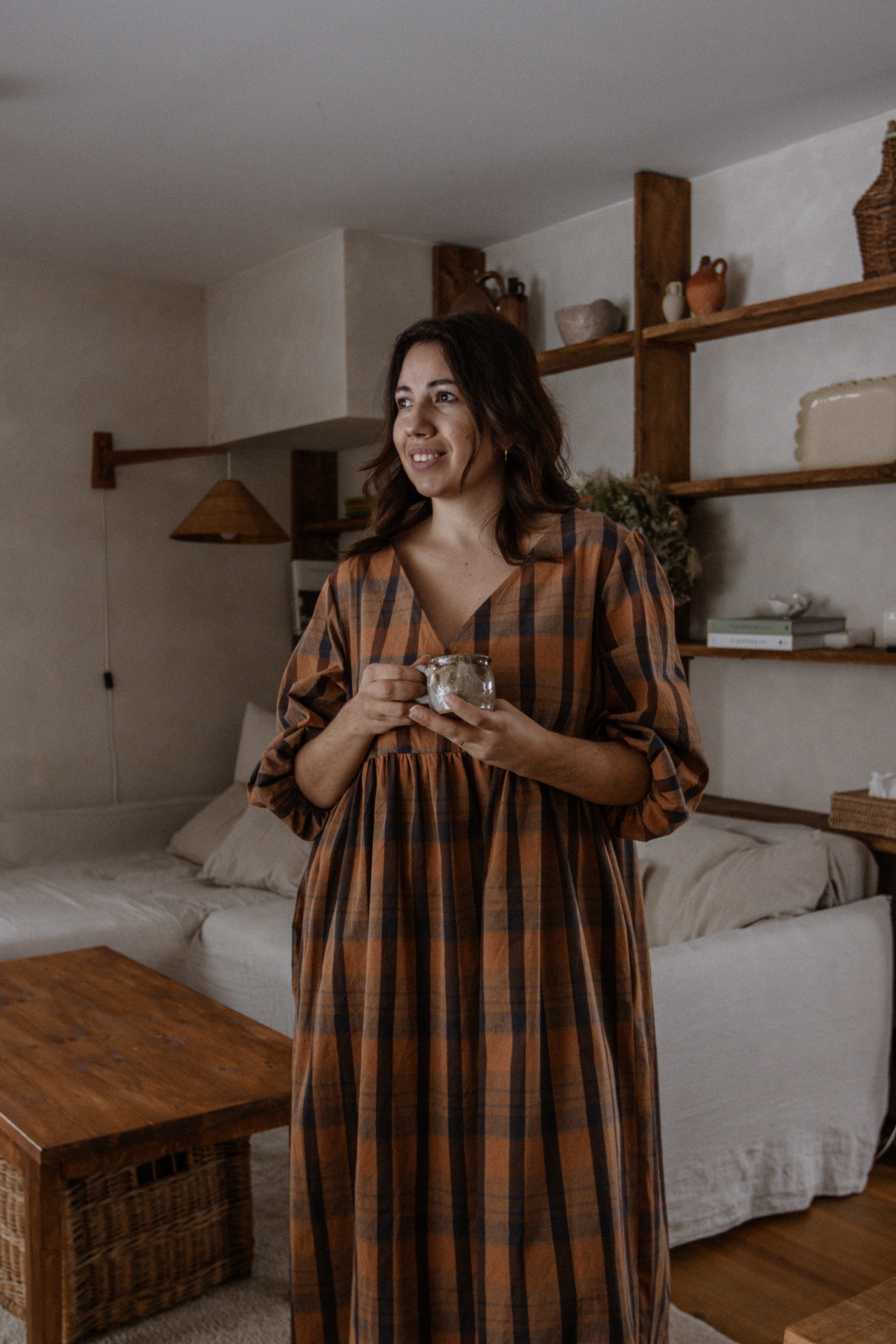 Zaujímavý oversize strih s prekladaným predným dielom a vreckami. Predný diel je zopnutý patentkou, aby zabránil otváraniu ale umožnil šaty nosiť aj v období dojčenia.