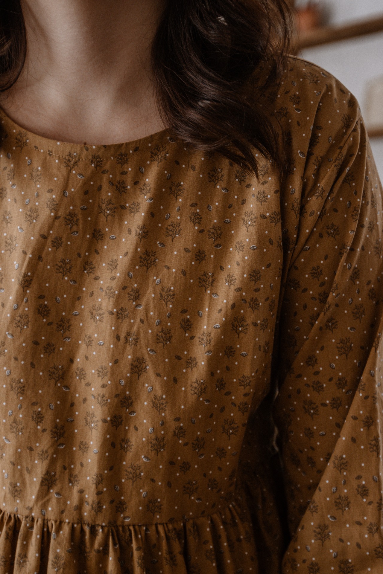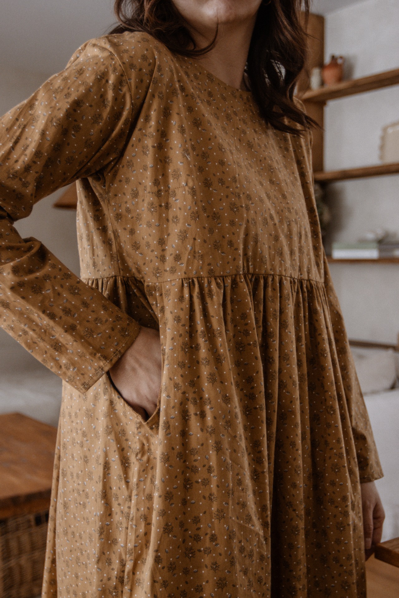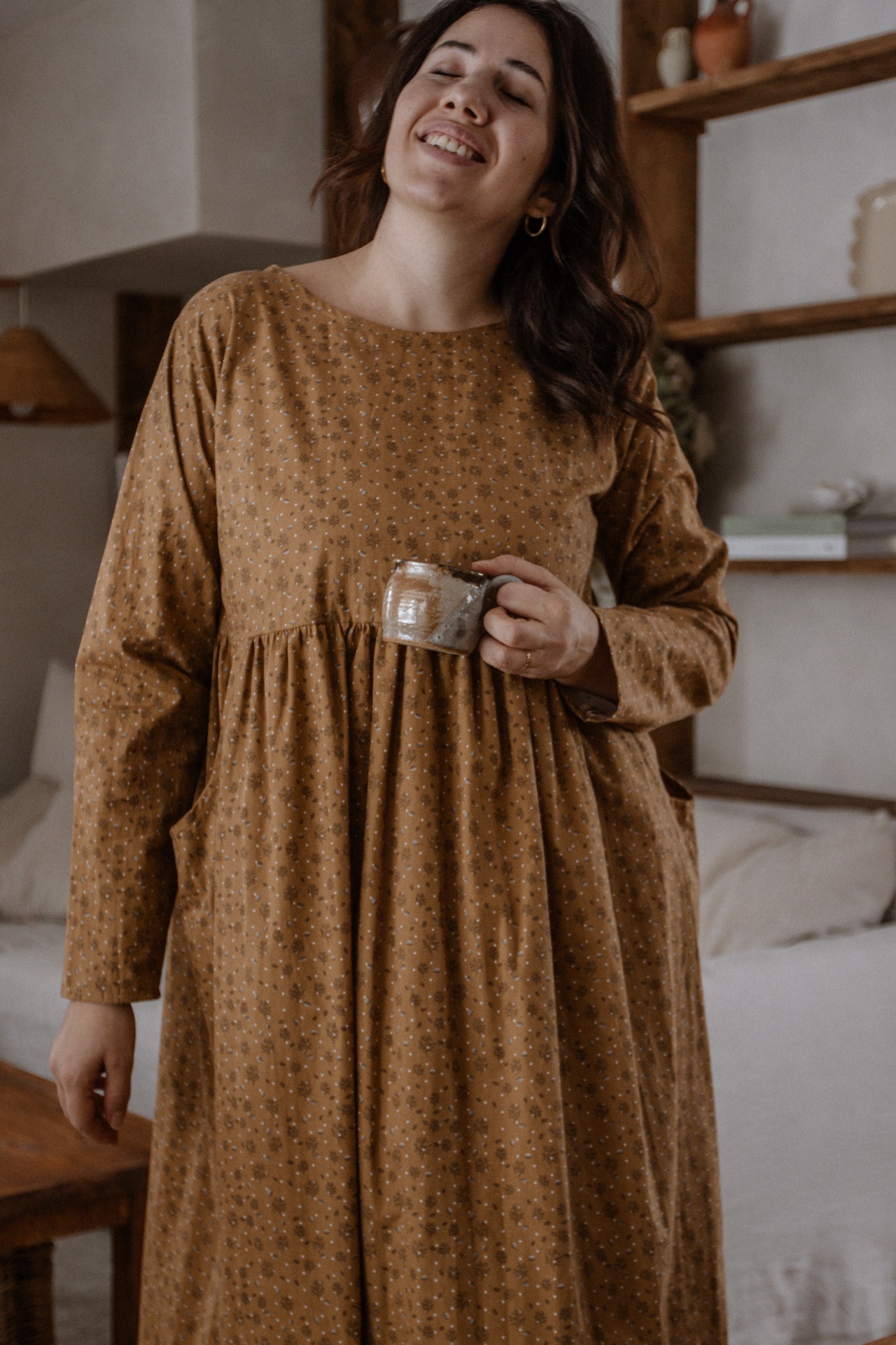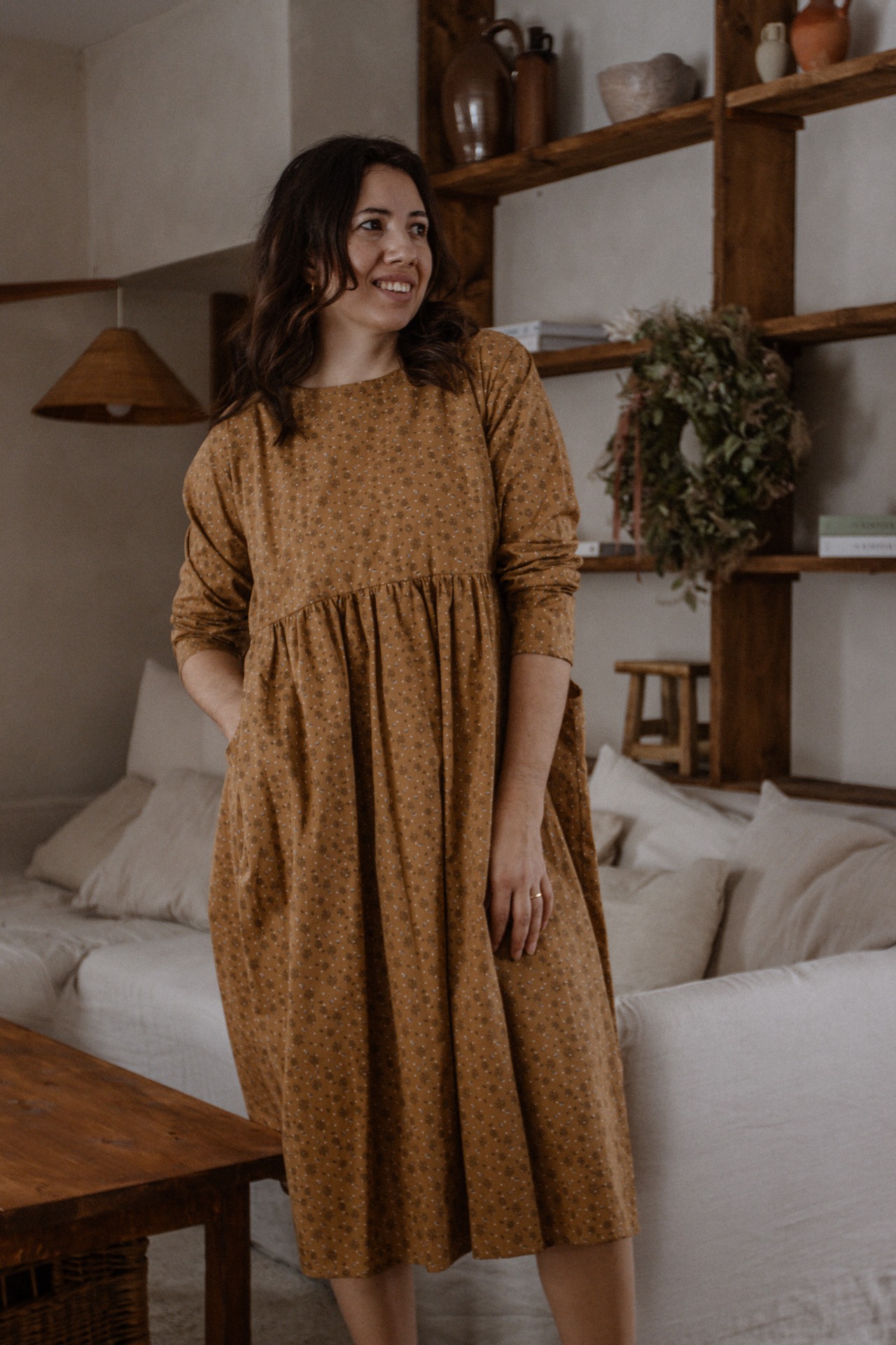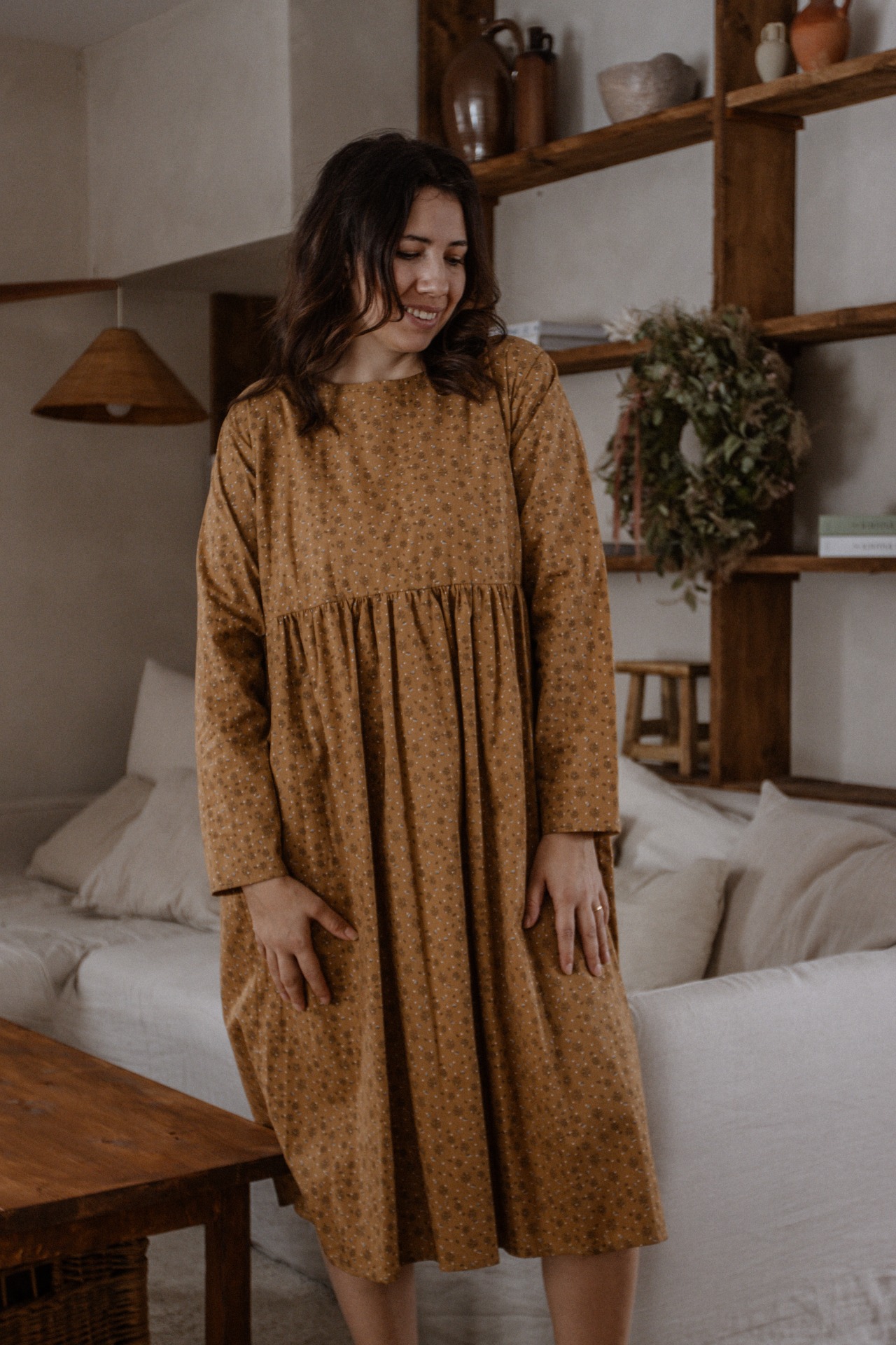 Pohodlné bavlnené midi šaty s vreckami a dlhým rukávom. Šaty sú mierne oversize strihu.