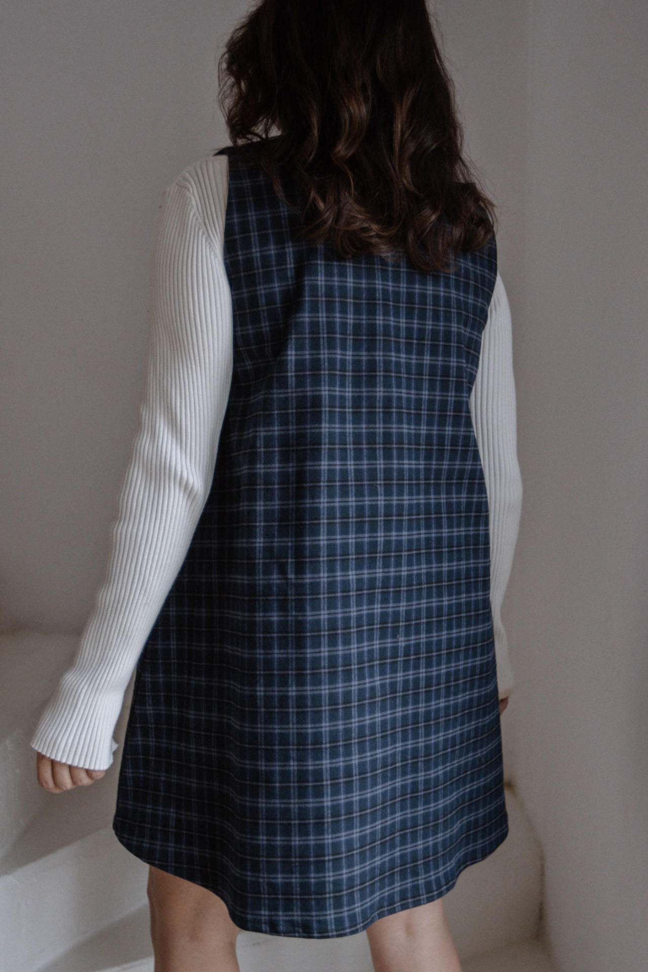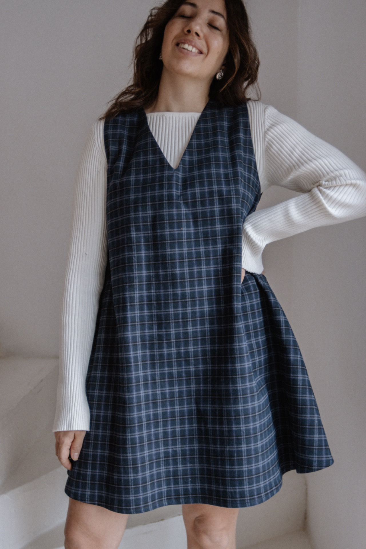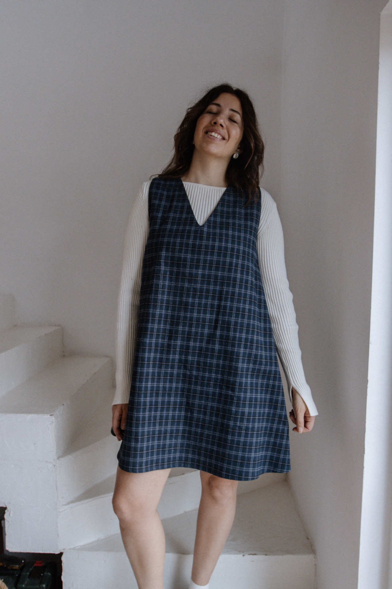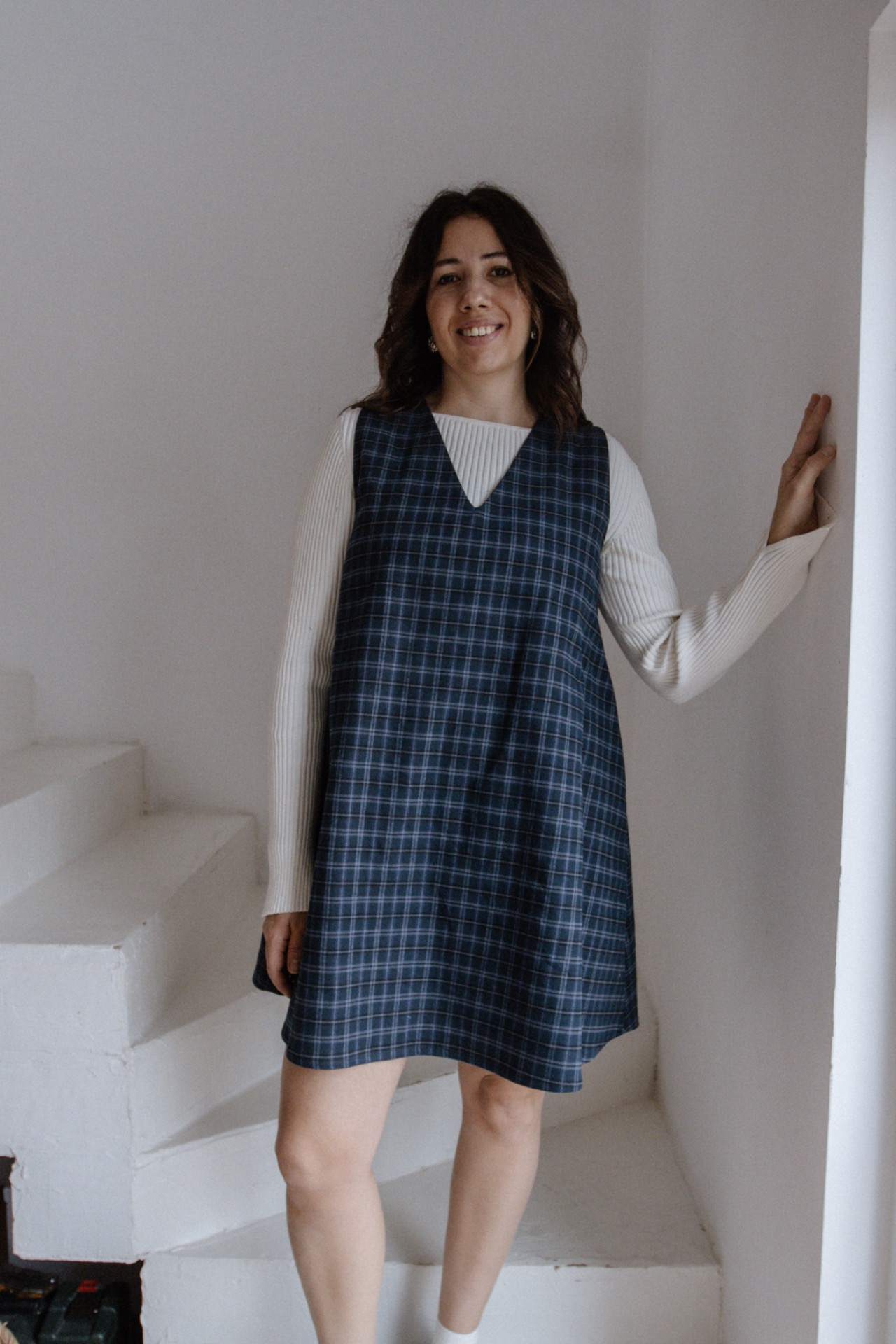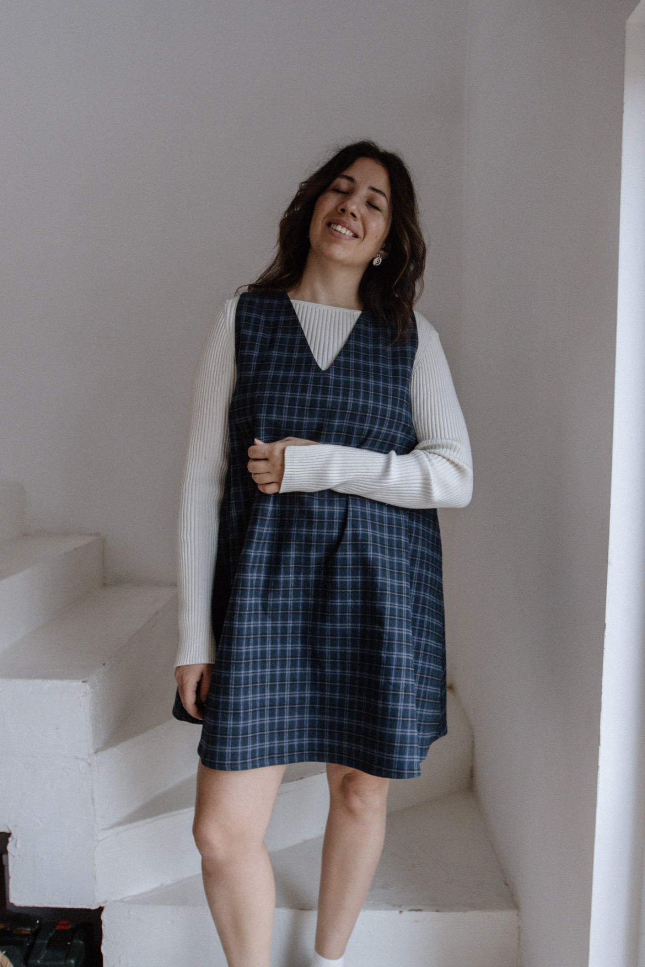 Mini šaty s výstrihom do V z kockovanej deadstock látky. Látka je pevnejšia, mierne elastická, pripomínajúca džínsovinu. Strih šiat je voľnejší, aby bolo možné pohodlné vrstvenie cez tričko, svetrík prípadne košeľu.
