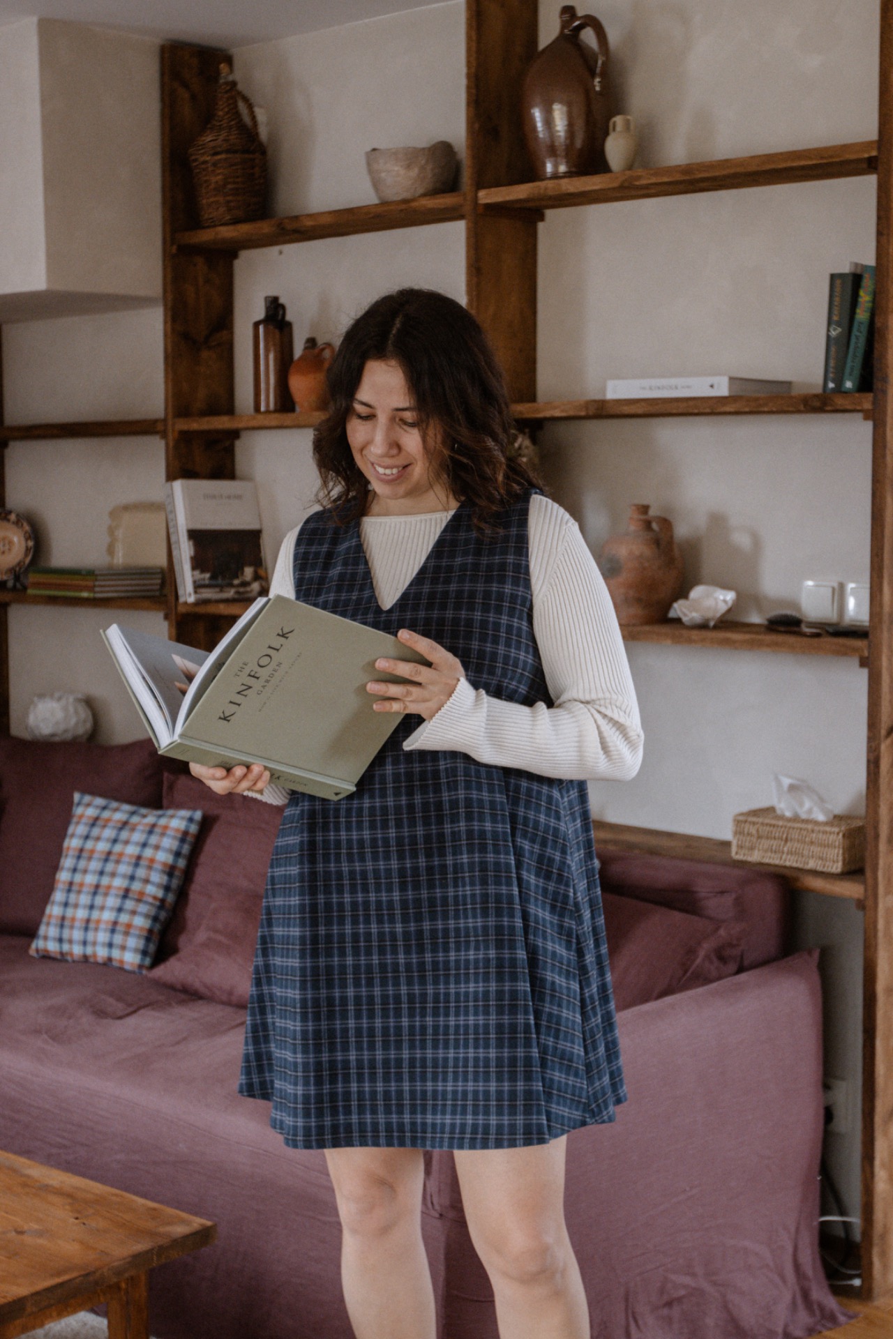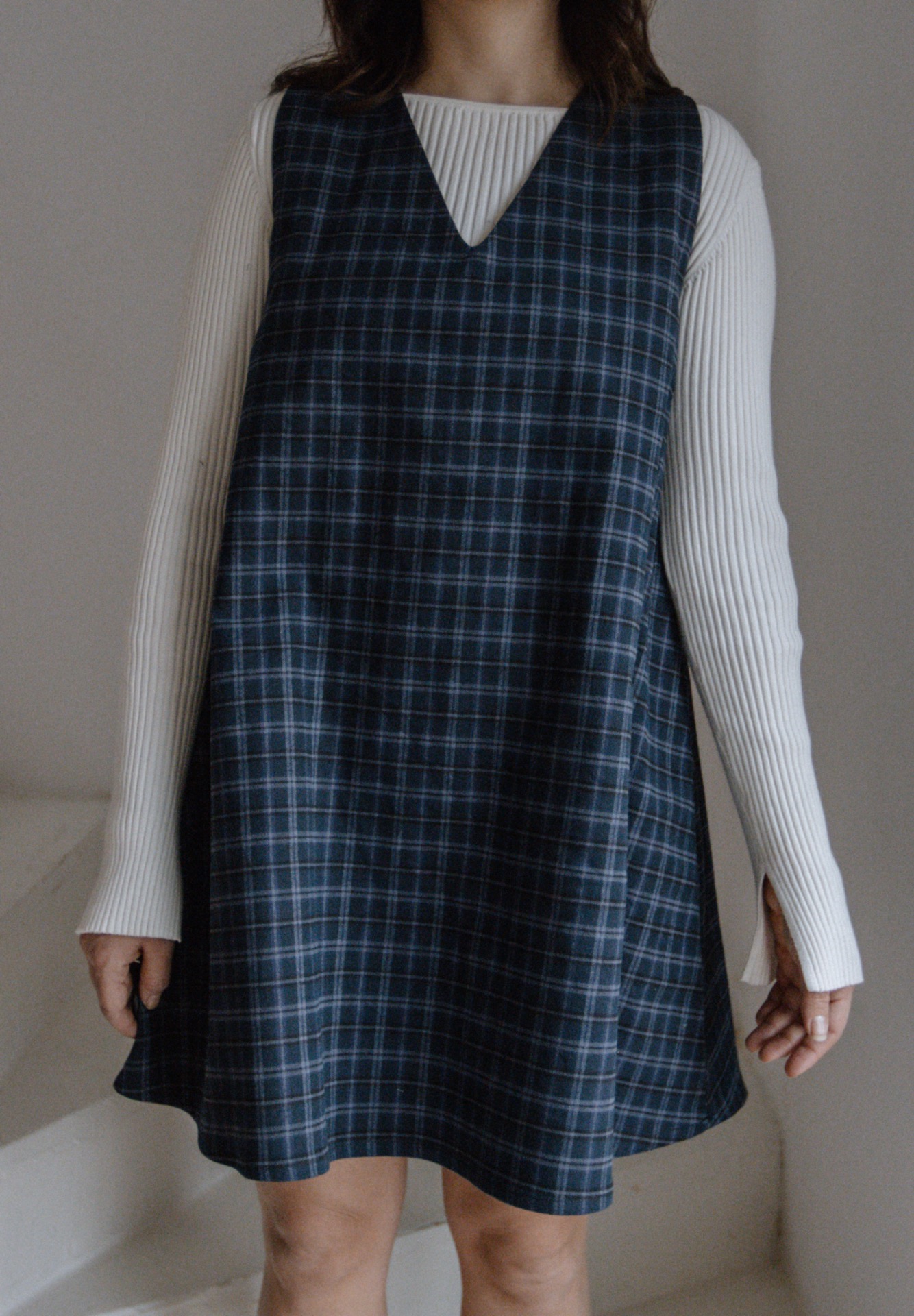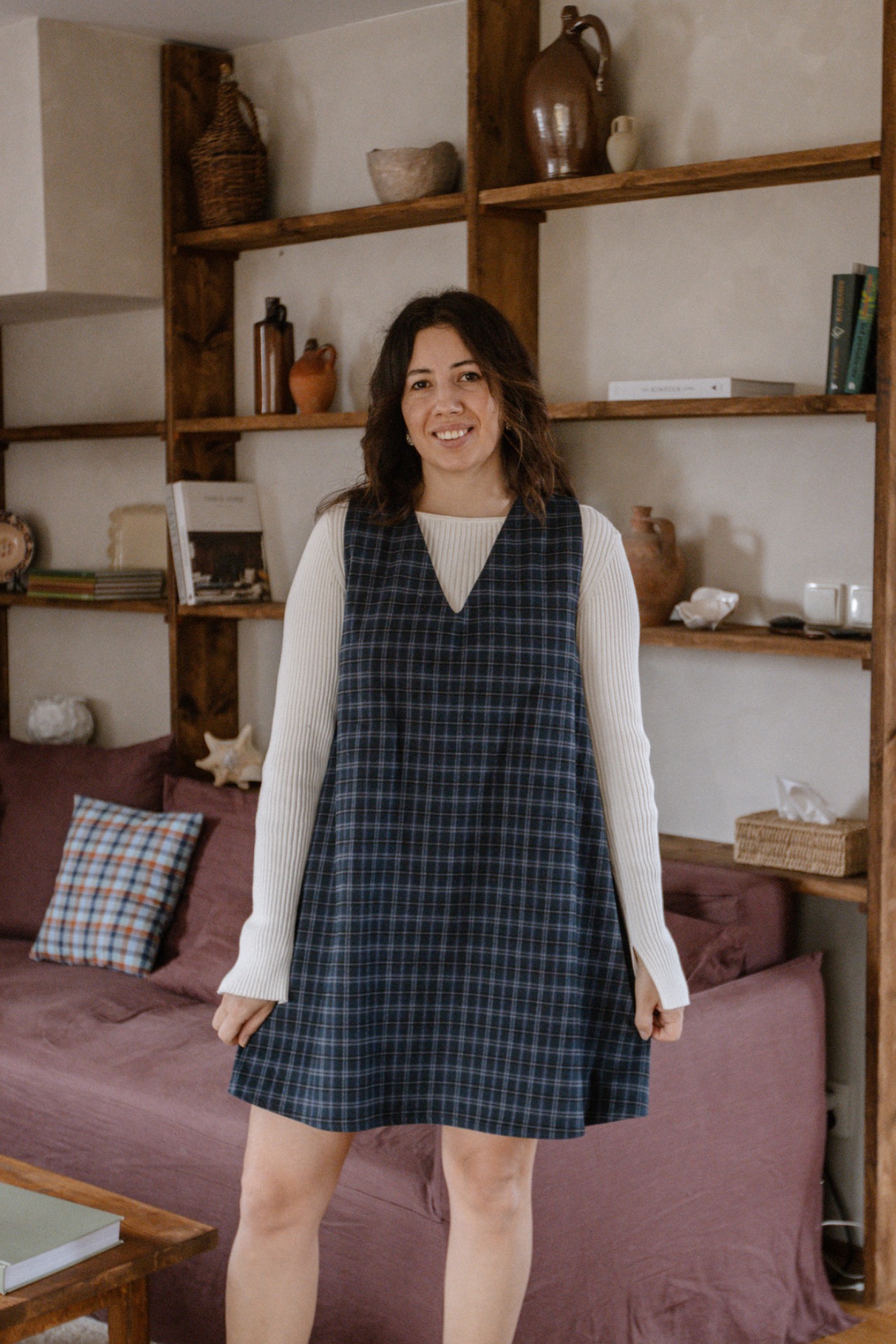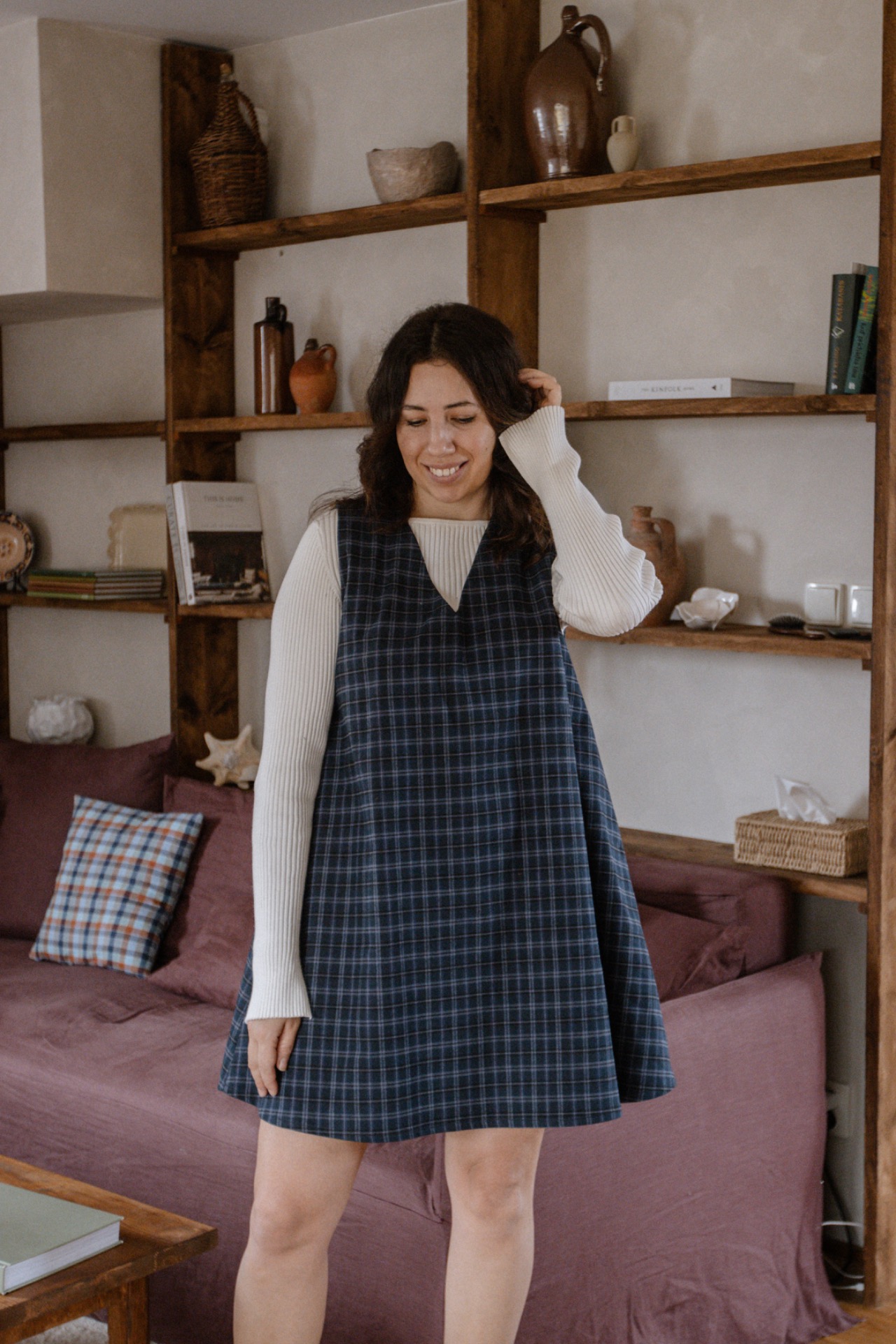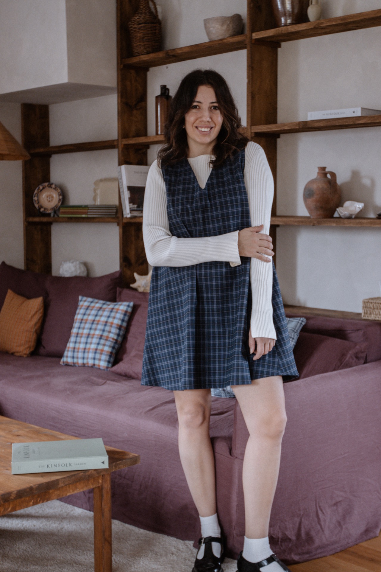 Mini šaty s výstrihom do V z kockovanej deadstock látky. Látka je pevnejšia, mierne elastická, pripomínajúca džínsovinu. Strih šiat je voľnejší, aby bolo možné pohodlné vrstvenie cez tričko, svetrík prípadne košeľu.