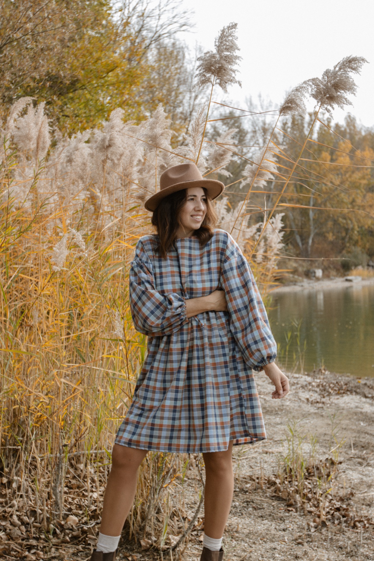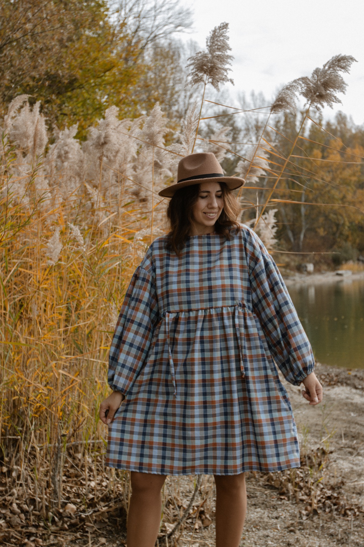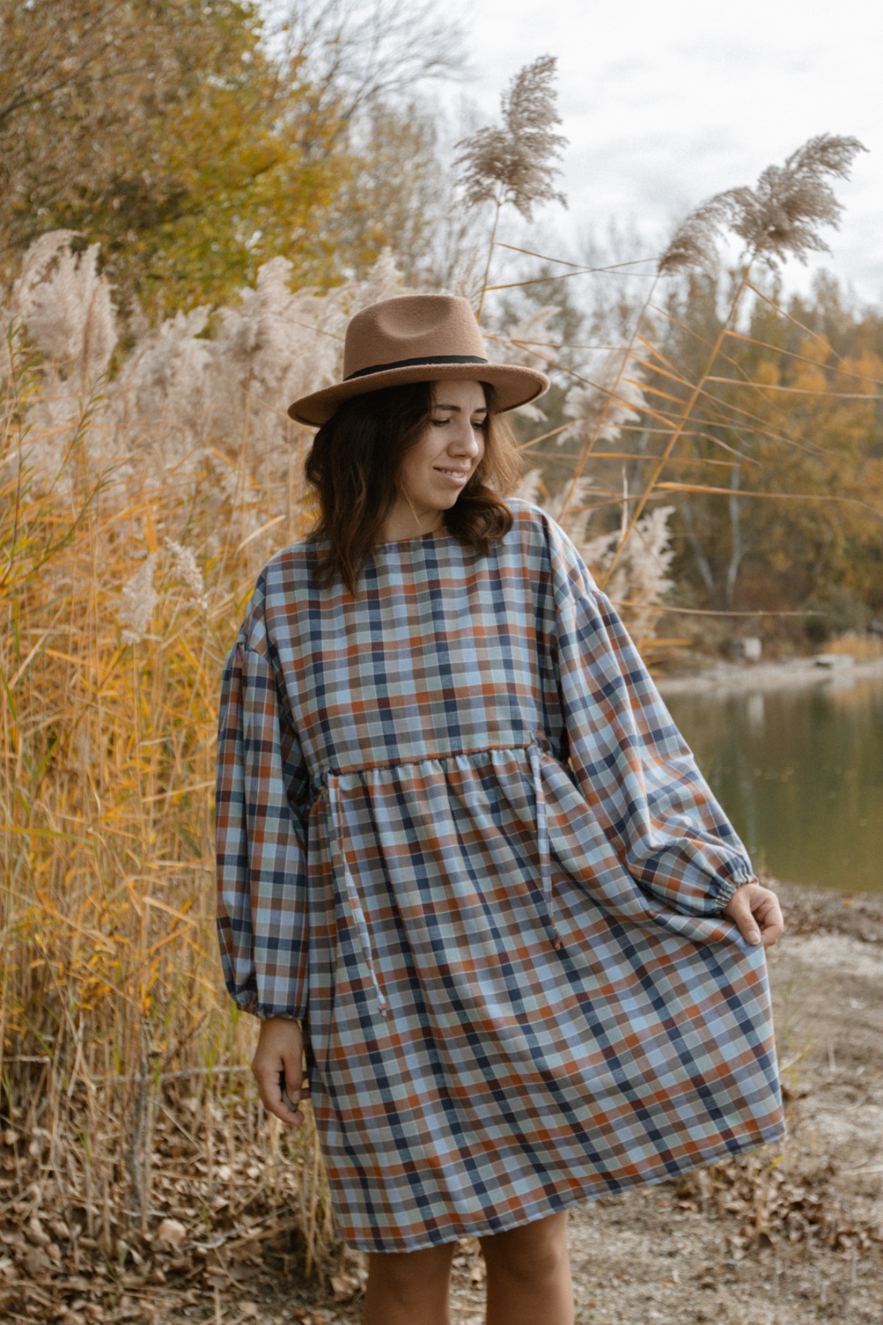 Pohodlné oversize voľné šaty/tunika, ktoré sa dajú nosiť pohodlne ako šaty alebo ako tunika cez nohavice. Jedinečný kockovaný vzor a sťahovanie na páse dodávajú tomuto kúsku šmrnc.
