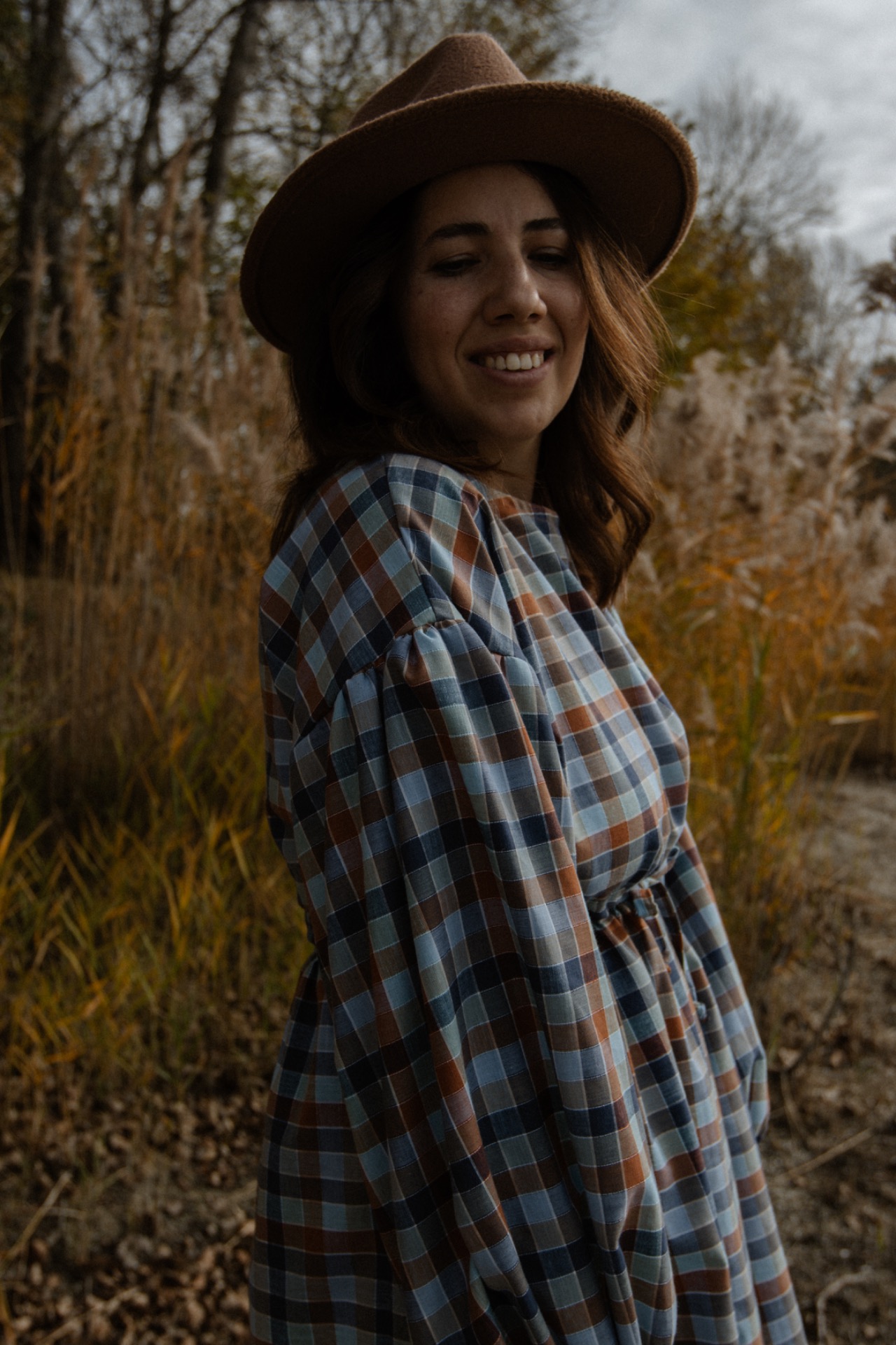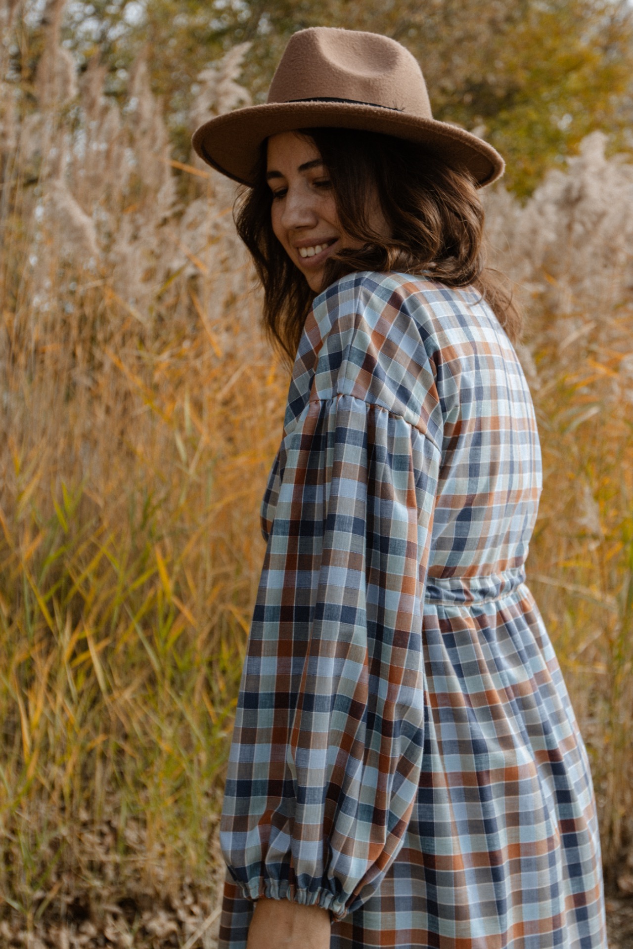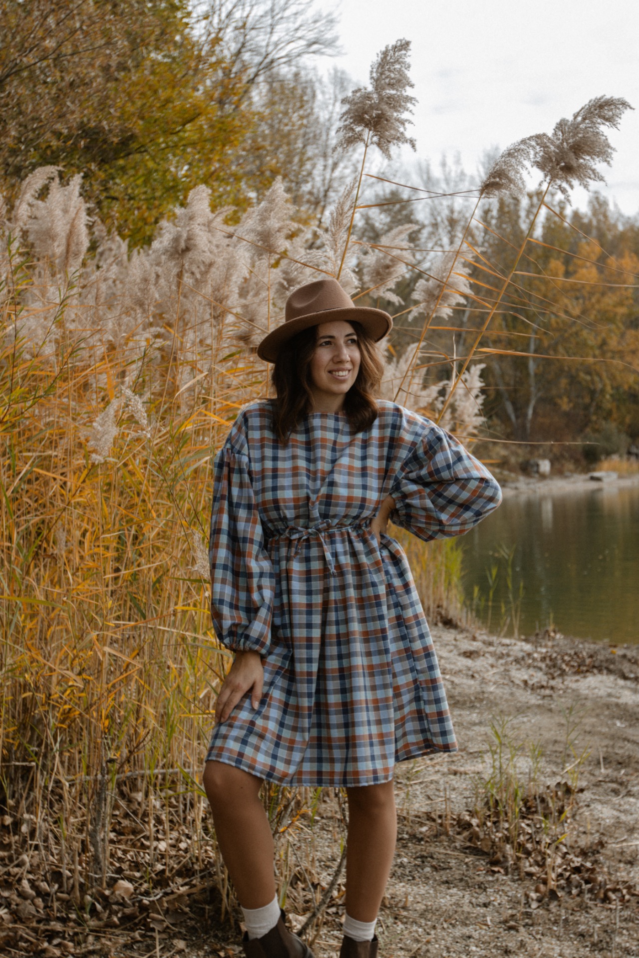 Pohodlné oversize voľné šaty/tunika, ktoré sa dajú nosiť pohodlne ako šaty alebo ako tunika cez nohavice. Jedinečný kockovaný vzor a sťahovanie na páse dodávajú tomuto kúsku šmrnc.