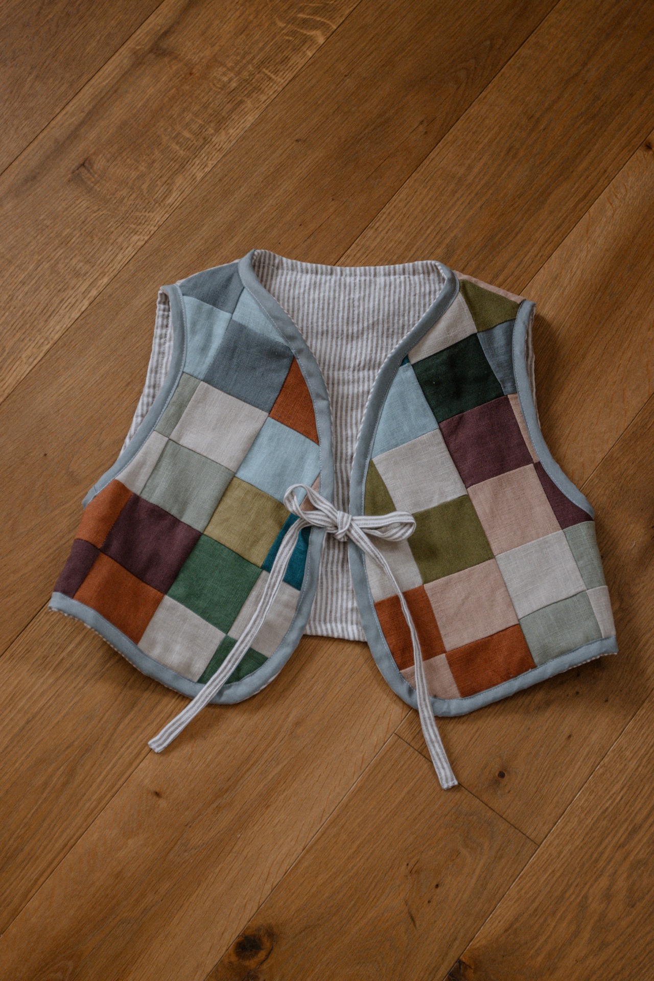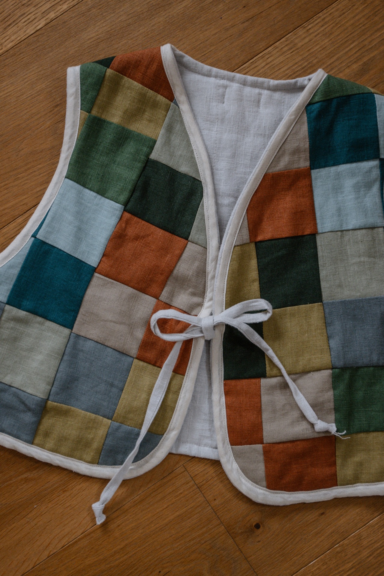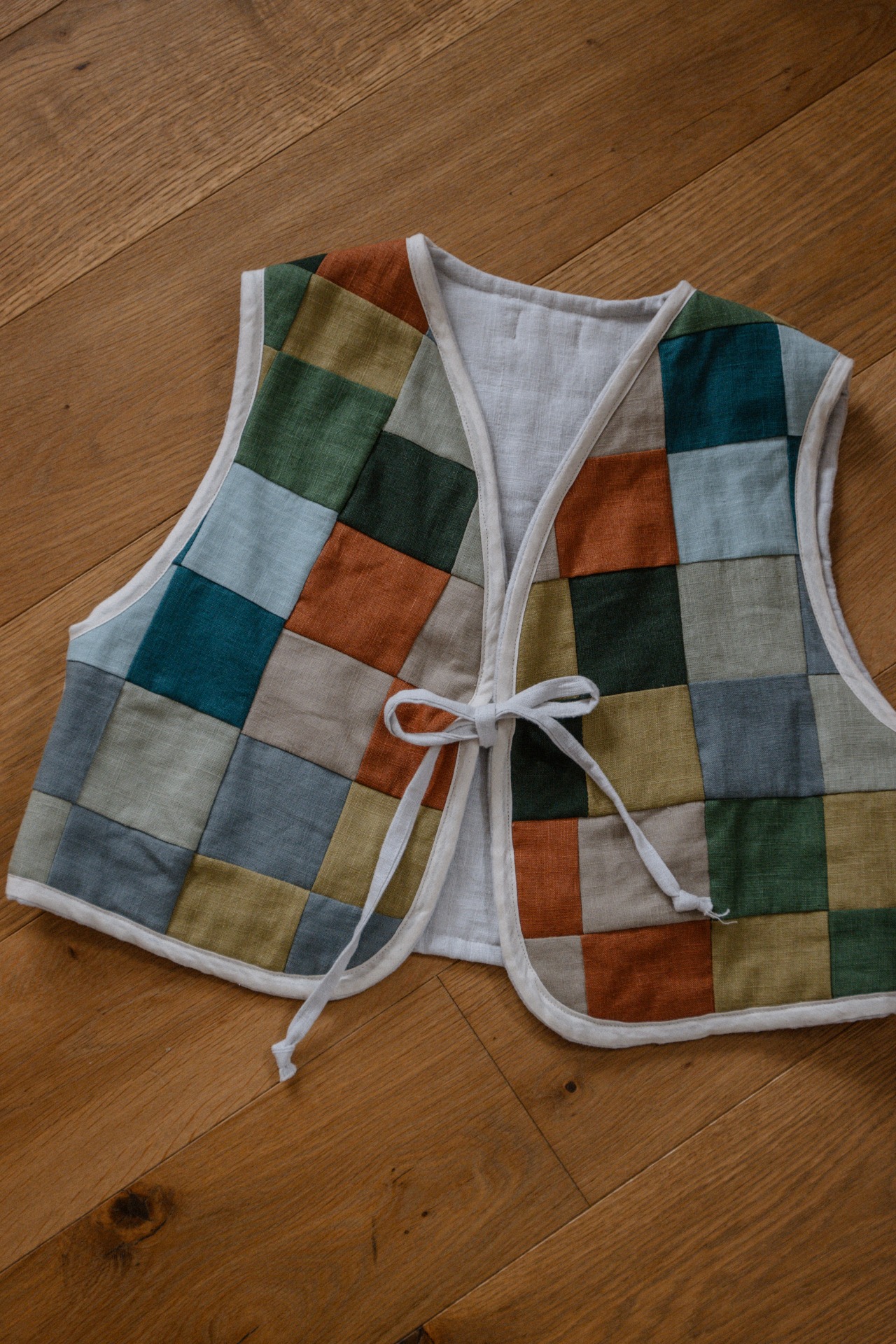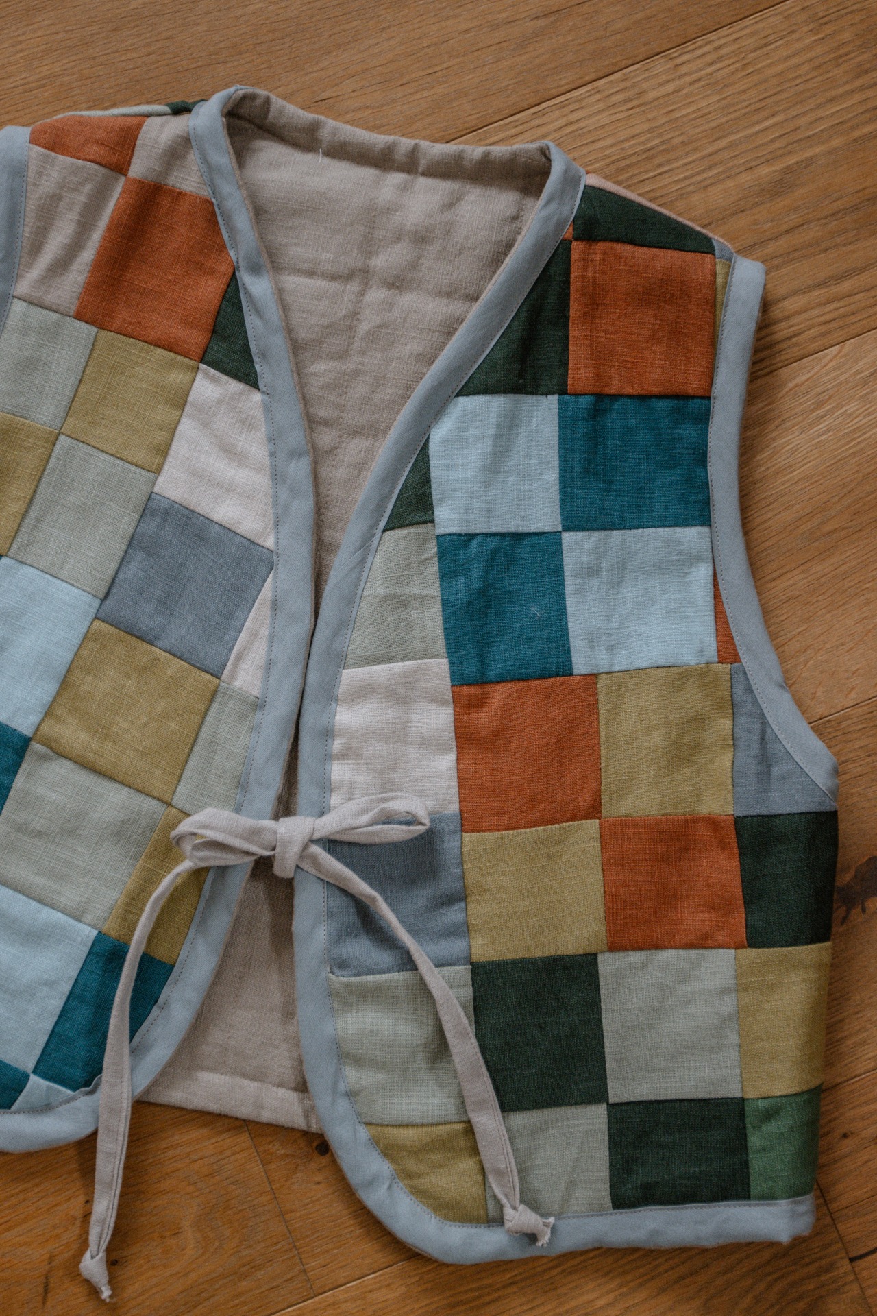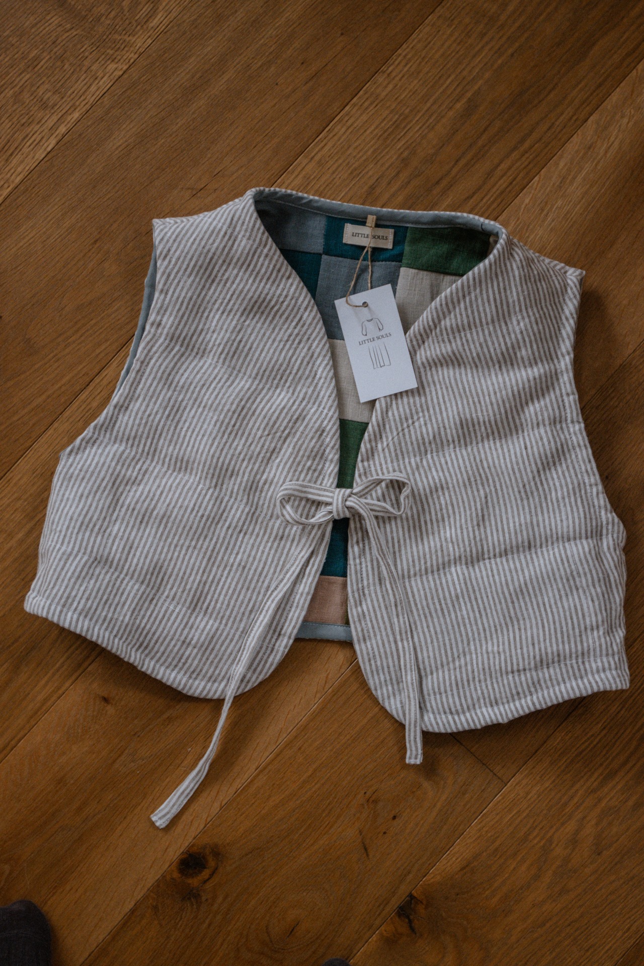 Každá vesta je unikát. Vzniká zo zvyškov ľanových lúskov, je prešívaná a obojstranná.
