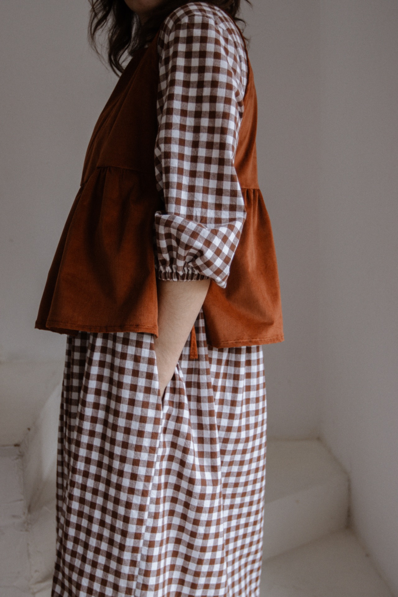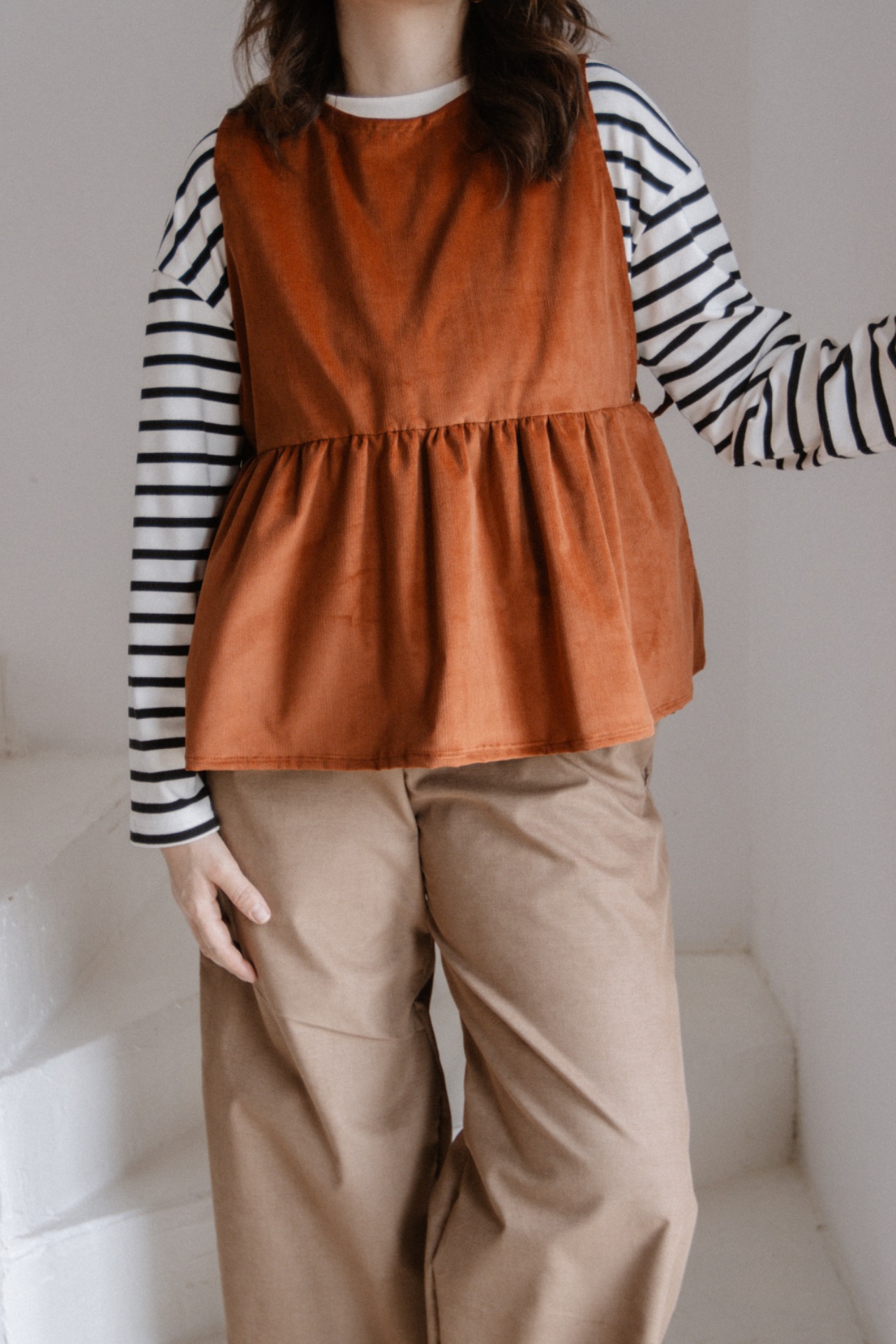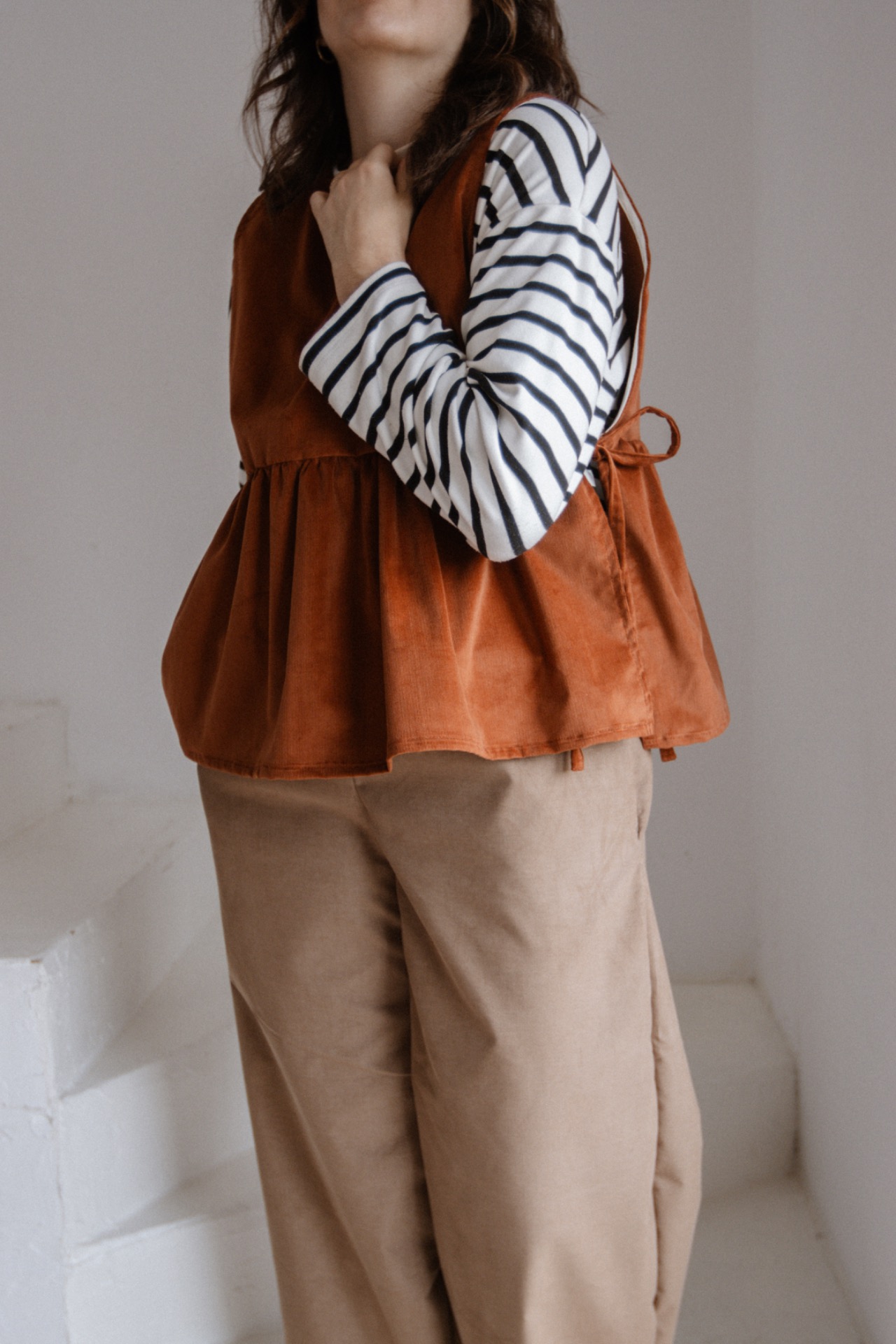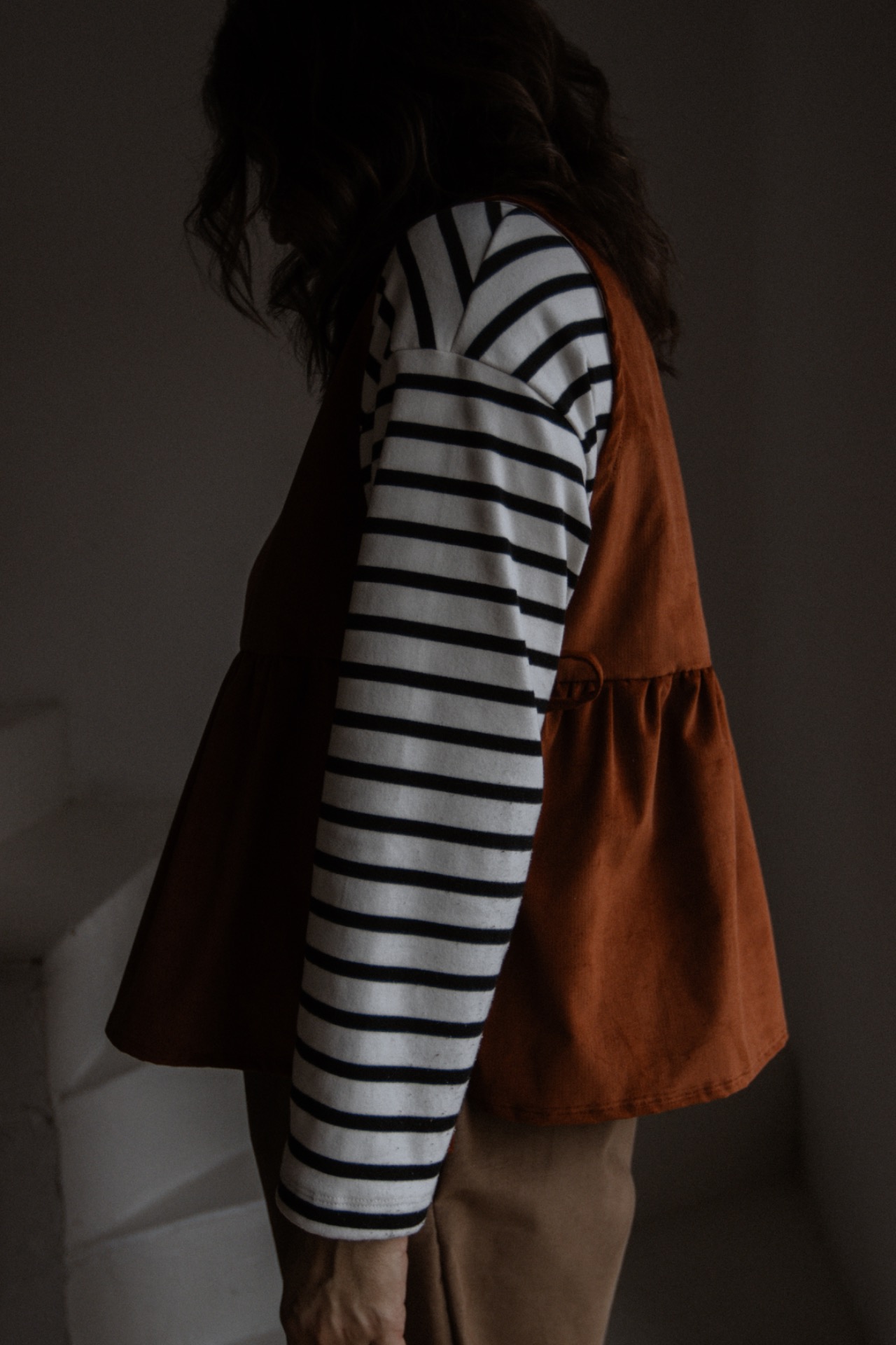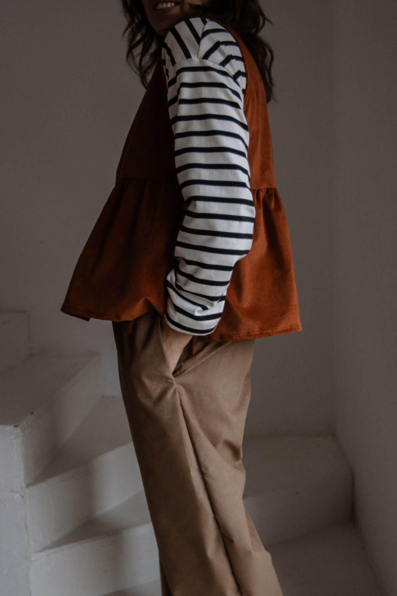 Volánová vesta z menčestru, ktorá nielen zahreje, ale osvieži aj jednoduchý outfit.